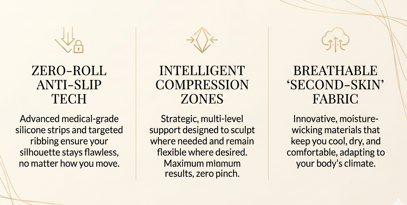 Whether it’s our signature high-waisted sculptors or our 'second-skin' bodysuits, every piece is engineered to stay in place from your morning meeting to your midnight gala.